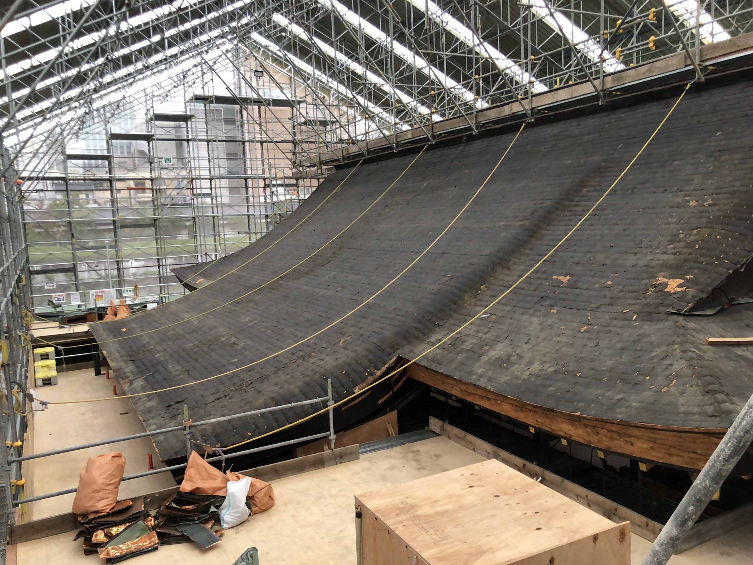 10月末におよそ全体の古い銅板が取り外されました、これからは防水シートを取り除いて野地板(下地板)の損傷箇所を取り替えます。